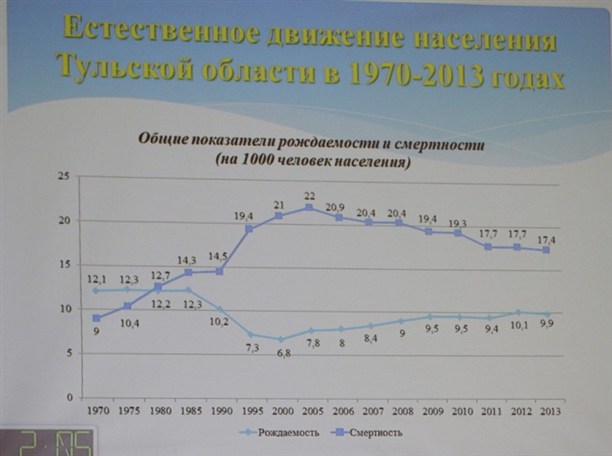 Министр труда и социальной защиты Тульской области Наталия Николаева сообщила, что, начиная с 2000 года, в Тульской области происходило увеличение числа родившихся и показателя рождаемости. Но в 2013 году произошло прогнозируемое снижение рождаемости, связанное с уменьшением числа женщин, находящихся в наиболее благоприятном репродуктивном возрасте (18-34 года) - родилось 15110 малышей (в 2012 году родилось 15517 детей).