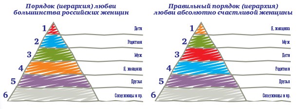 Вы нарисовали свою иерархию важности любви. Понятно, что всех этих людей вы любите, они вам дороги. Но кто-то всё-таки оказался важнее. Правильный порядок любви — такой, который обеспечивает вашу счастливую жизнь, в которой есть место и душевному теплу, и телесному наслаждению, и правильной организации ума, — таков: