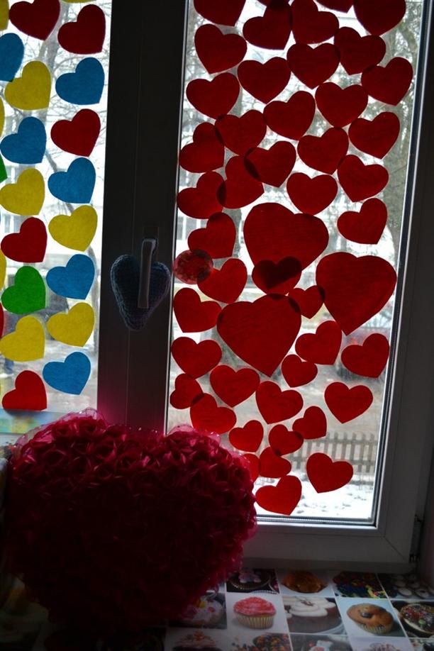 14 февраля у меня есть традиция: утром обклеивать окошки сердечками из цветной бумаги. Уже 3-й год я так делаю.