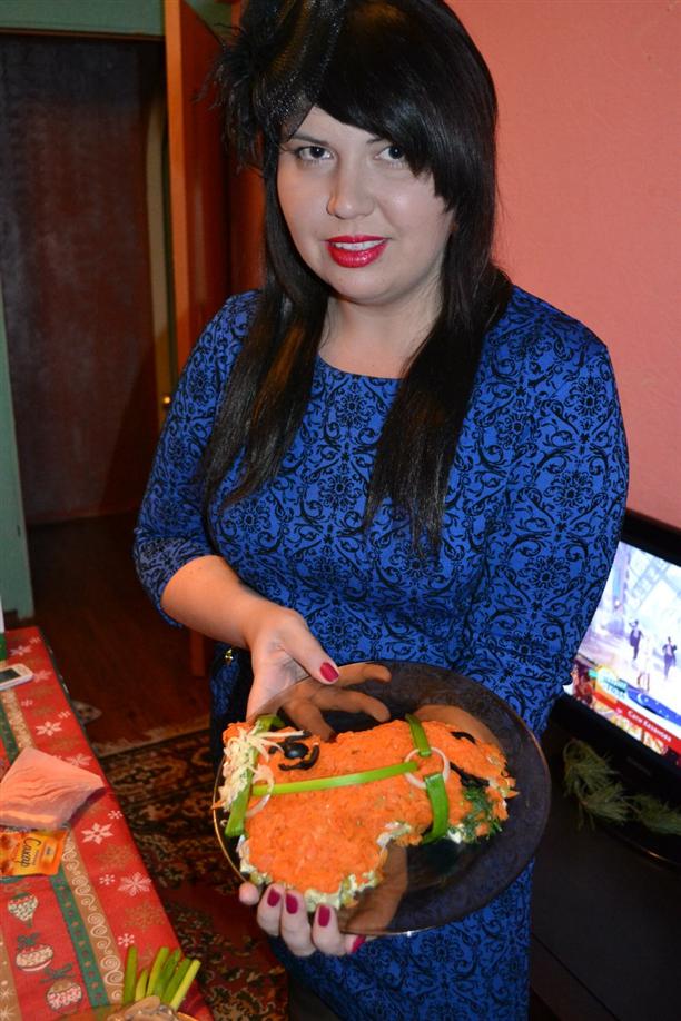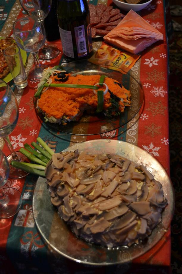 Потом приехал друг, и мы готовили еду к праздничному столу. Артём приготовил мясо по-французски, а я нарубила салатиков и креативно их украсила.)