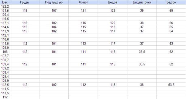 Вот так я начал вести табличку до начала занятий. Здесь замеры только за время занятий в N`Ergo. Последний замер вчера вечером.