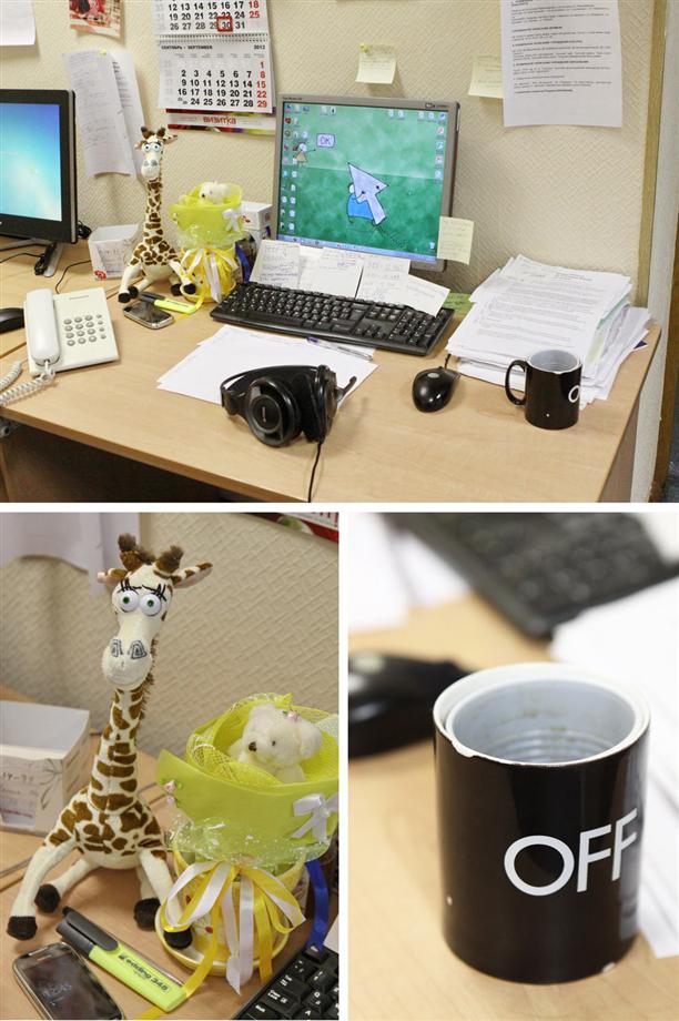 - Я считаю, что рабочее место должно доставлять удовольствие. Не только физическое (удобство, например), но и эстетическое. Поэтому меня ежедневно радует своими глупыми глазками жираф (напоминает, что мозги есть и без них никуда), ну а относительно "букета из медвежонка" - я просто люблю цветы, но живые бы быстро завяли. Нашла вот такую альтернативу)) От комментариев относительно пустого стаканчика в кружке - отказываюсь) Это будет сложно объяснить)