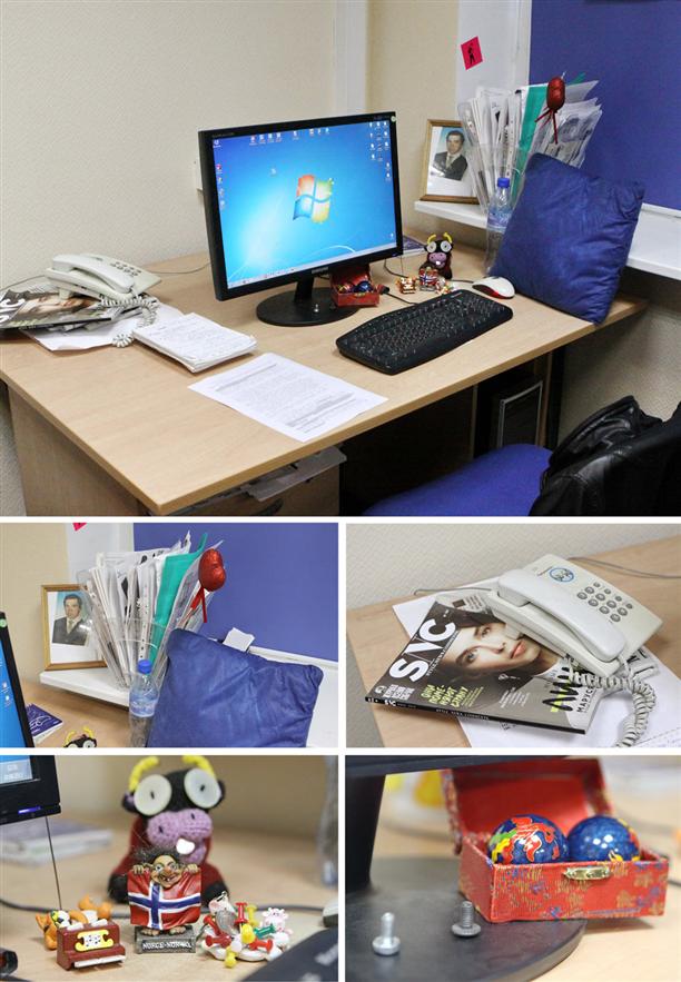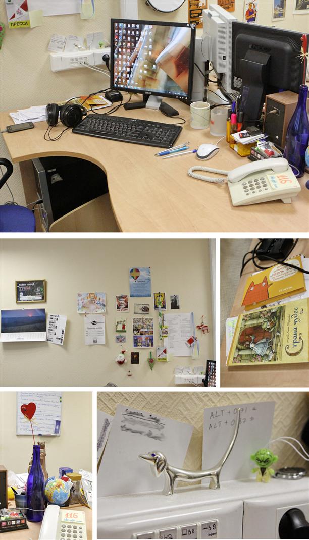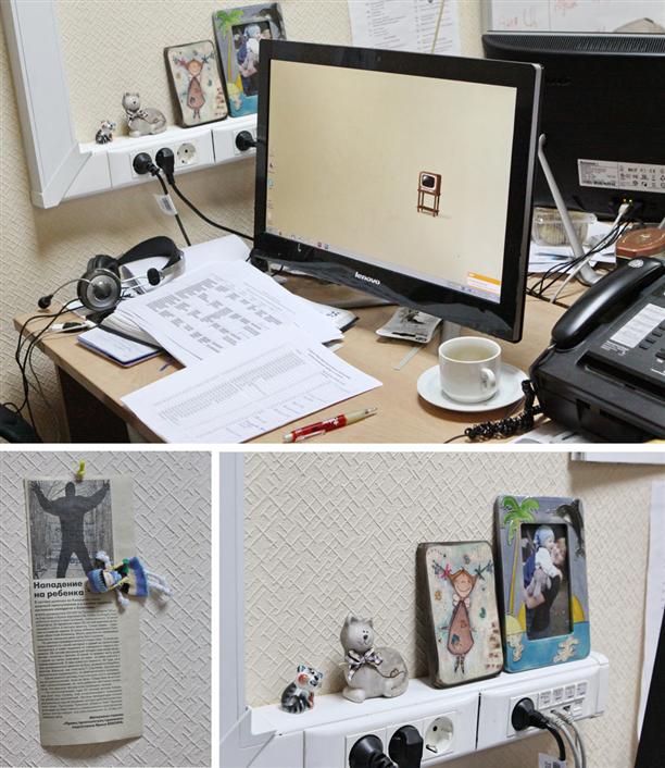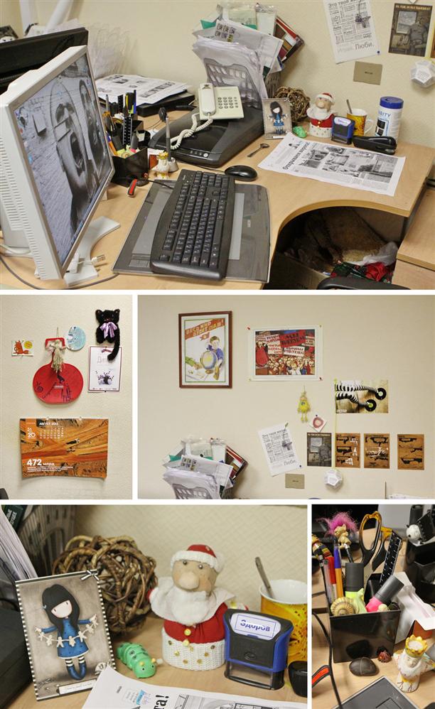- Мое рабочее место - это кусочек безумного хаоса. Это ни разу не "домик"! Здесь редактору никак не укрыться от звонков читателей, от прихожан с письмами и жалобами, от рекламных менеджеров. Но я люблю свое рабочее место. Тут у меня есть все необходимое для работы. Вот тот маленький котик с "гитлеровской" челкой помогает мне придумывать заголовки. Большая кошка - это просто его дама и я им не мешаю, она не в моей компетенции. Картинка с девочкой помогает вспомнить о том, что все в этой жизни тлен и суета. А фото с дочкой - о том, что это вовсе не так ;).