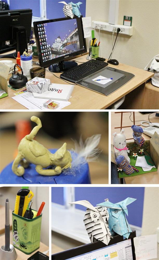 А вообще, думаю, на рабочем месте журналиста несомненно должен быть хаос! Жаль, что у меня много документов и важных бумаг, а то бы я с удовольствием "пригласила" бы к себе на стол еще больше душевных и замечательных персонажей. Например, ручную сову Вертыша (пока он в машине живет), я вас с ним попозже познакомлю ;).