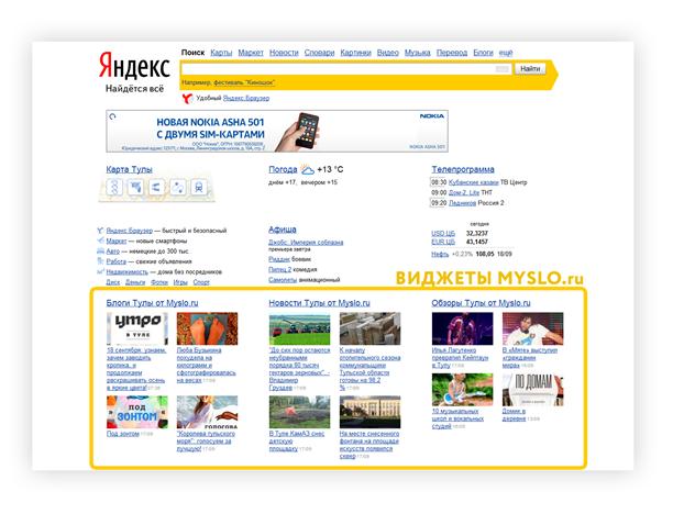 Виджет — это небольшой информационный блок, размещенный на главной странице Яндекса. Если вы дружите с Яндексом, то Myslo.ru вам тоже не враг. Рекомендуем установить вам наши новые свежие супер-виджеты, чтобы не пропускать самое интересное из жизни города.