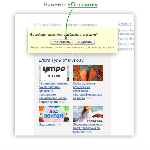 Для установки виджета кликните по его названию или иллюстрации и нажмите на кнопку «Оставить» — он сохранится на главной странице Яндекса.