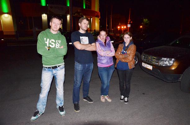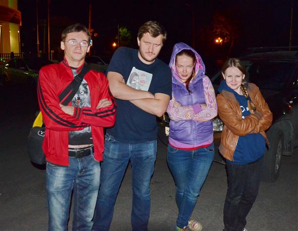 Сразу представлю пятерку бравых и смелых: я (Мария Кучерова, ответственная за разгадку заданий), Сергей Коваленко (супер-драйвер), Ксения Грибкова (ответственная за хорошее настроение в экипаже), Алексей Герасимов (опытный дозорный, поисковик кодов и штурман) и Лев Рычковский (также ответственный за поиск кодов, да и просто ответственный:). Наскребли по знакомым фонарей, оделись "во что не жалко" и айда вечером пятницы на Крестовоздвиженскую площадь. Там узнали, что соперничать с нами будут еще 12 команд. И не все новички в этом деле! Далее следовало долгое и немного путаное объяснение правил игры - про поиск кодов, что это и с чем едят. (Ксения ближе к концу объяснений: Черт. Я уже забыла, что было в начале.)