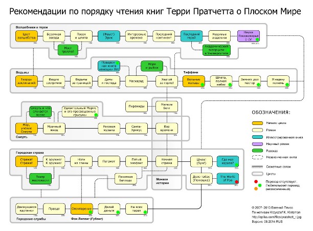 Циклов всего шесть: Ринсвинд (о волшебниках, героях и не совсем героях Плоского мира), Ведьмы (переворачивающий представление о ведьмах с ног на голову), Тиффани (вроде продолжения цикла о ведьмах, но с развитием в сторону), Смерть (как раз о том, о чем я прочла первую книгу Пратчетта, о Смерти и его внучке (!), Стража (об аналоге полиции в самом большом городе Плоского мира, Анк-Морпорке - ничего не напоминает?), Фон Липвиг (о почтальоне Плоского мира, вот этот цикл я упустила).