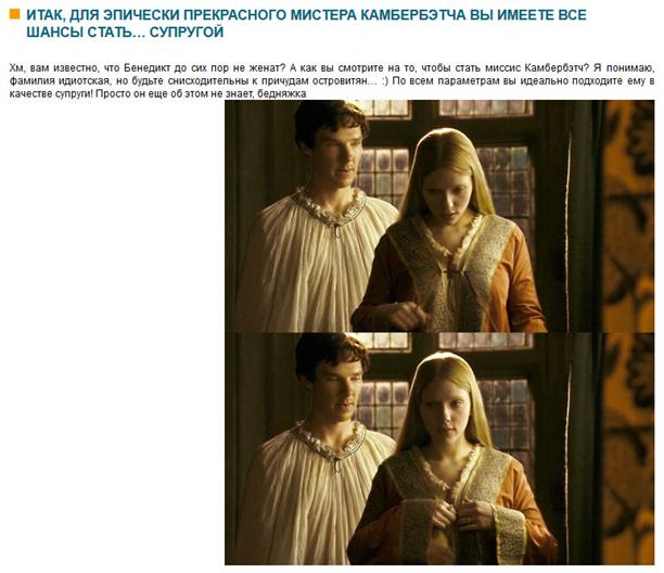 Сериал в очередной раз помахал нам ручкой... Ну что ж. Лично я буду ждать продолжения (мне очень нравится Мориарти!). А пока ТЕСТ с идиотским названием "Кем вы можете стать для Бенедикта Камбербэтча?" Я поиграла, поулыбалась, предлагаю и вам. Соотнесём наши иллюзии и реальность ;)