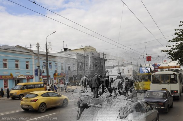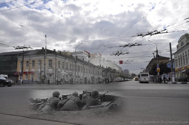 Тула 1941/2013 Советские бойцы в окопе на перекрестке ул.Коммунаров (совр. пр.Ленина) и Советской улицы.