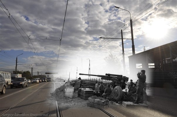 Тула 1941/2013. Пр. Ленина, 30. Тульские рабочие на строительстве баррикады. Укрепления и баррикады, возведенные в Туле сыграли важную роль при отражении вражеских атак.