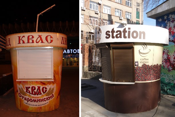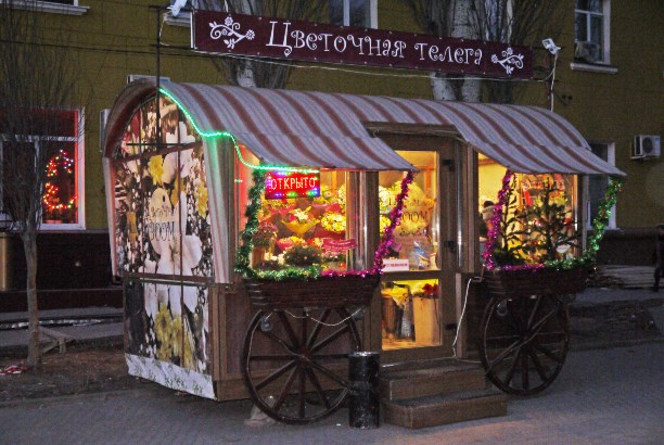 Ещё из ростовского примечательного - тематические уличные палатки. Цветы продают в "Цветочных телегах", кофе - в стаканчиках, квас - "через трубочку" и т. д. и т. п. Симпатично.