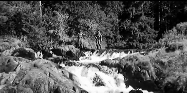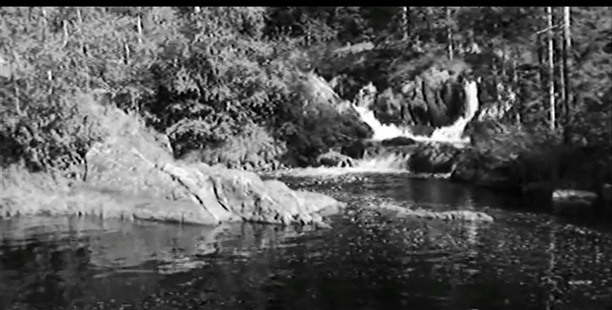 Домика этого, конечно, тогда не было. Мы предположили, что это тот домик, который стоял в лесу и где по сюжету прятались немцы. Возможно, его перенесли сюда после съемок, а возможно, у него было совсем другое назначение. Водопады и река сейчас особенно полновода -весна только пришла в эти места, снег тает и переполняет русла.