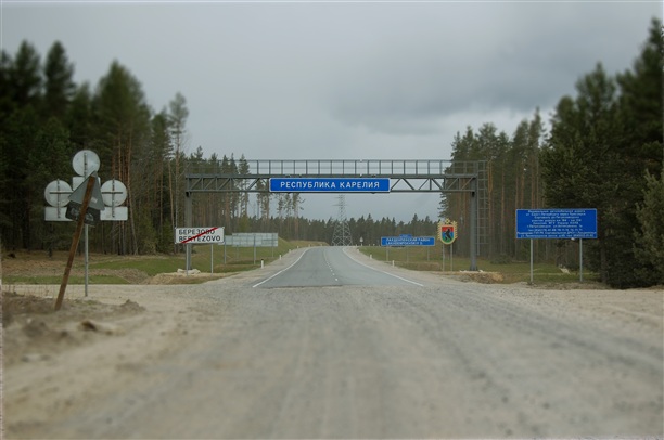 Поездку мы спланировали за месяц, найдя довольно удаленное от цивилизации, но относительно не бивуачное жилье. От СПб ехать до места нашего назначения оказалось не так далеко. С учетом нашего местоположения - чуть дальше. Путь занял около 5-6 часов. Последним оплотом цивилизации стал город Приозерск, что находится на западной части Ладожского озера. После него же дороги резко стали хуже, местность заметно холмистее и то здесь, то там стала появляться вода в том или ином виде. Хотя назвать дороги хуже-нельзя. Их просто не стало. Вот так выглядела граница Лен.области и Республики Карелия...