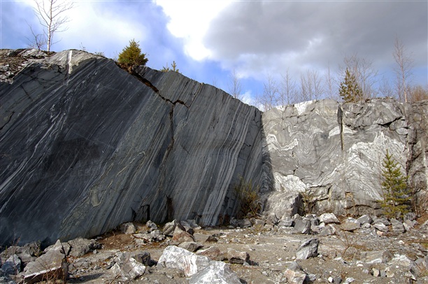 Здесь мрамор снимался пластами. И на прямых отвесных срезах можно увидеть рисунок мрамора, который получался при том или ином срезе.