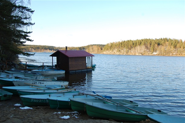 Заметно померзнув, пошли в плавучую баньку на самом берегу озера. И как полагается отходили друг дружку веничками и поныряли в стальные воды печального в непогоде озера.  Берег и банька находятся в низиночке и путь в ним лежит через круглые, сглаженные дождями скалы, на которых растут сосны.