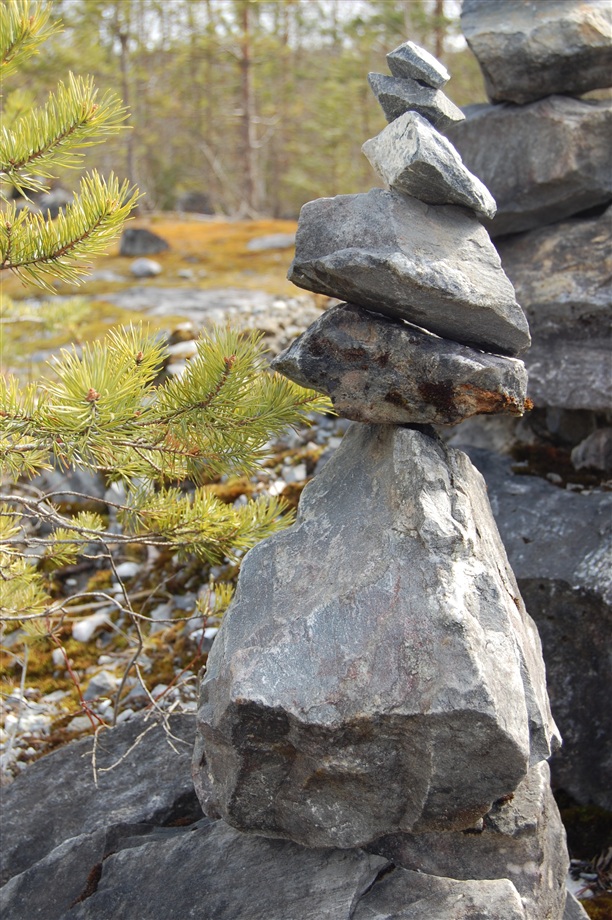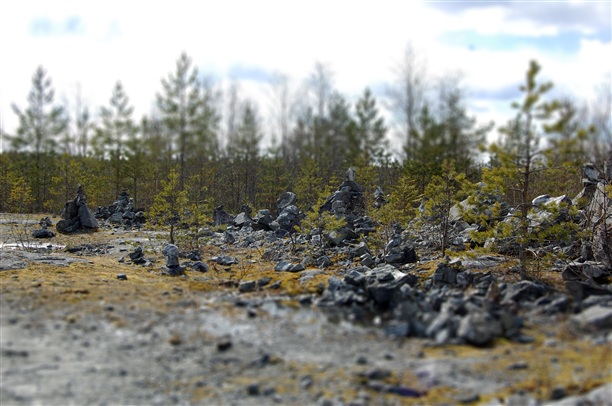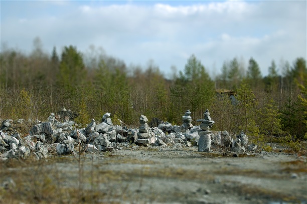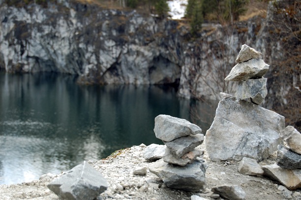 Но даже больше живописи природы меня впечатлило единение людей, которые когда-либо посещали это место. Поначалу, попадая на место этой разработки, кажется, что вся территория в хаотичном порядке завалена камнями разного размера, но это не так. Приглядевшись, понимаешь, что основная часть территории покрыта пирамидками, которые встречались и прежде в парке, но тут творчество достигло апогея: камни большого размера лежат на маленьких, держаться на честном слове... и их так много!