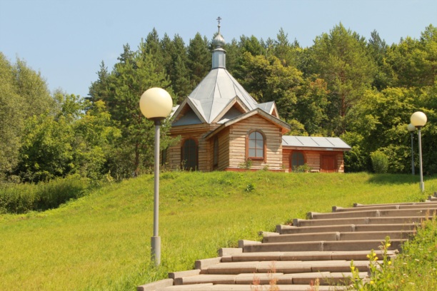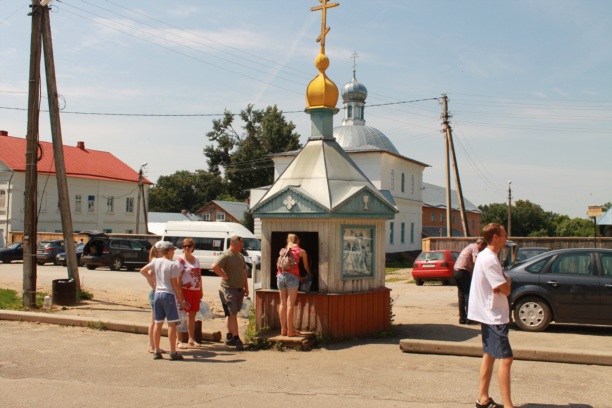 Автомобильная парковка расположена прямо напротив храма и места набора целебной водицы.