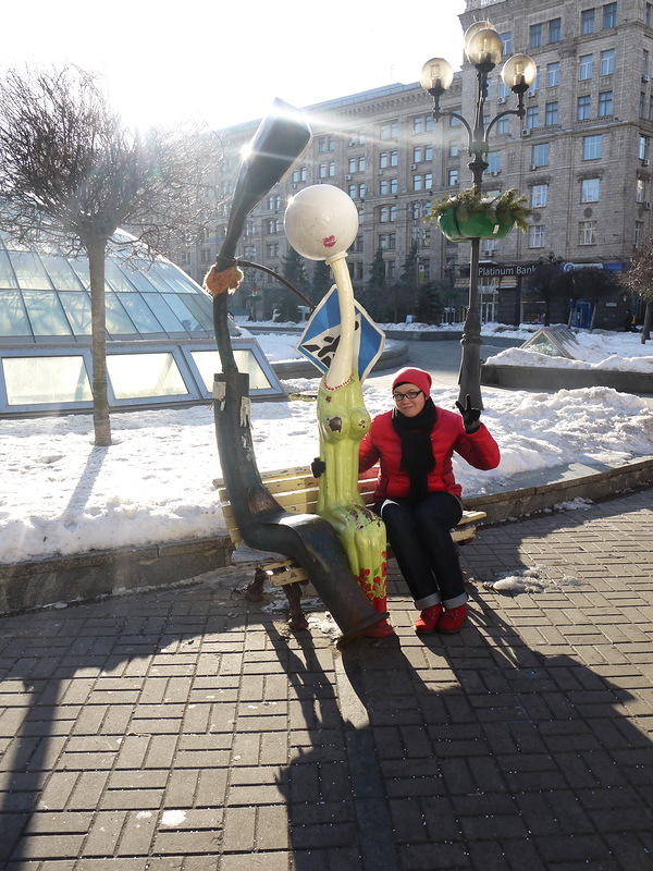 "Влюбленные фонари" на Майдане. На маленькой уютной лавочке сидят двухметровый фонарь-мужчина и его романтичная шароголовая спутница (не путать со мной! я тоже шароголовая, но не его!). Он обнимает ее, она что-то шепчет ему на ухо... Никаких сомнений, у них любовь! Любовь светлая, не угасающая. Эта необычная скульптура появилась накануне Дня Святого Валентина в 2009 году и сразу обрела своих почитателей! У "влюбленных фонарей" назначают свидания, поют песни под гитару, с ними любят фотографироваться (чем я и занимаюсь!).