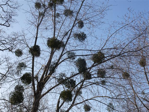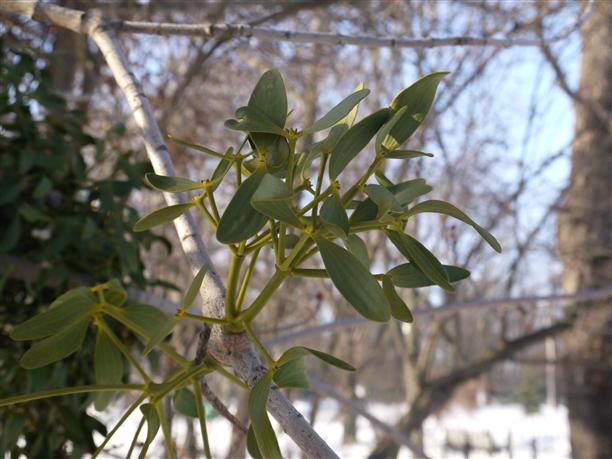 А вы видели деревья, в ветвях которых будто бы застряли кружевные шары?.. В Киеве таких множество! Издалека кажется, что среди ветвей просто висят птичьи гнезда. Ранним утром, в кисельном тумане и цвет их кажется каким-то серым, неприметным, но как только выходит солнце, шары приобретают яркую зеленую окраску и версия с гнездами сразу становится смешной. Конечно же, это растения! Удивительные, непонятные, незнакомые (нам незнакомые). А потом мы узнаем, что это ОМЕЛА. Если отбросить всякие легенды, то это вечнозеленое растение-паразит, "птичий клей", который находит "приют" на кленах, тополях, ивах, березах... Разрастается от верхушки дерева яркими зелеными кустами, кормится от дерева-хозяина, цветет, плодоносит... и безусловно украшает! :)) Среди зимы это выглядит вообще настоящим чудом.