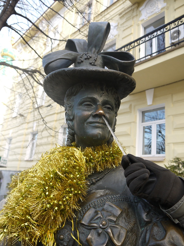 Маршрута как такового у нас не было, траектория рождалась на месте :) По Андреевскому спуску (в нашем случае подъему) мы пришли к Андреевской церкви, бронзовым Проне Прокоповне и Голохвастову :) Персонажи очень комичные, стоят недалеко от ресторана «За двумя зайцами», где мы имели честь отобедать кроликами, драниками и варениками вечером следующего дня :) Интересно, как много людей в наше время помнят фильм «За двумя зайцами»? :) Тем не менее жук, сидящий на пятой точке у Свирида Петровича, натерт до блеска, как впрочем и нос Прони Прокоповны - в знак особого уважения и согласно счастливым приметам.