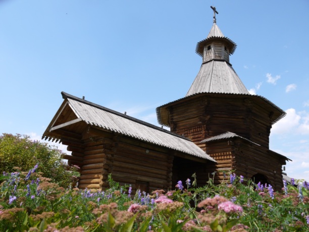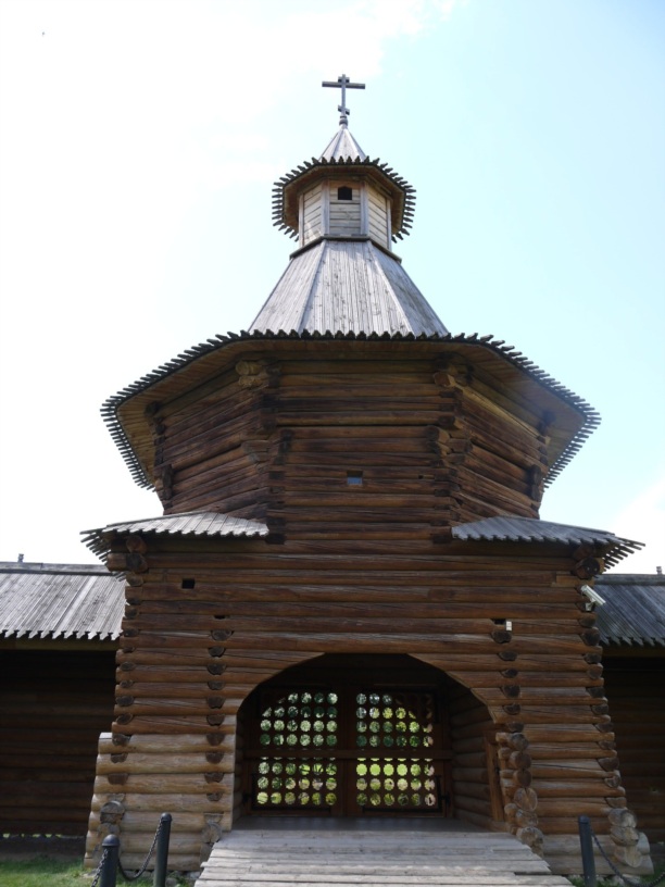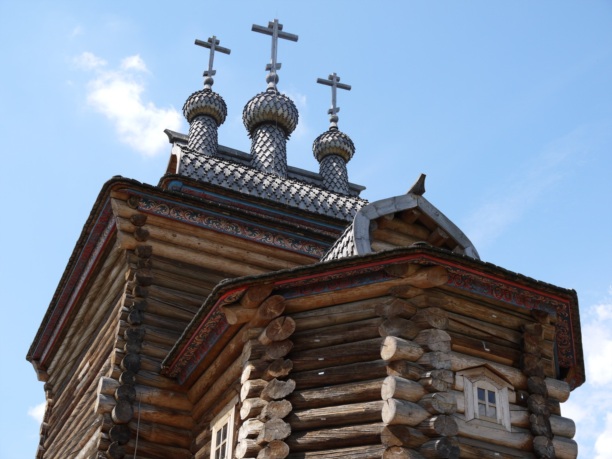Двухъярусное сооружение из сосновых бревен, так называемая «крыша-бочка», маленькие главки, расписной карниз… Яркий образец деревянного церковного зодчества. Был очень большой соблазн зайти внутрь. Почему-то не зашли, зачем-то сэкономили, чего-то испугались. В следующий раз обязательно.