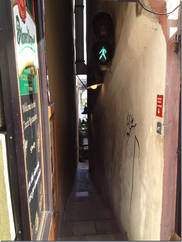 Иногда улочки в средневековом городе сужаются до такой степени, что пройти может только один человек. Тогда ставят светофор. Нажал на кнопку-на том конце загорелся красный свет.