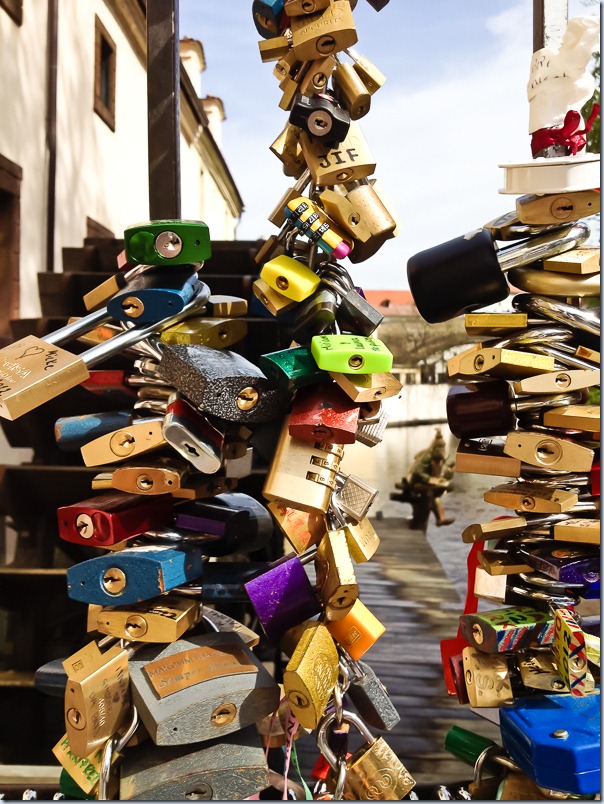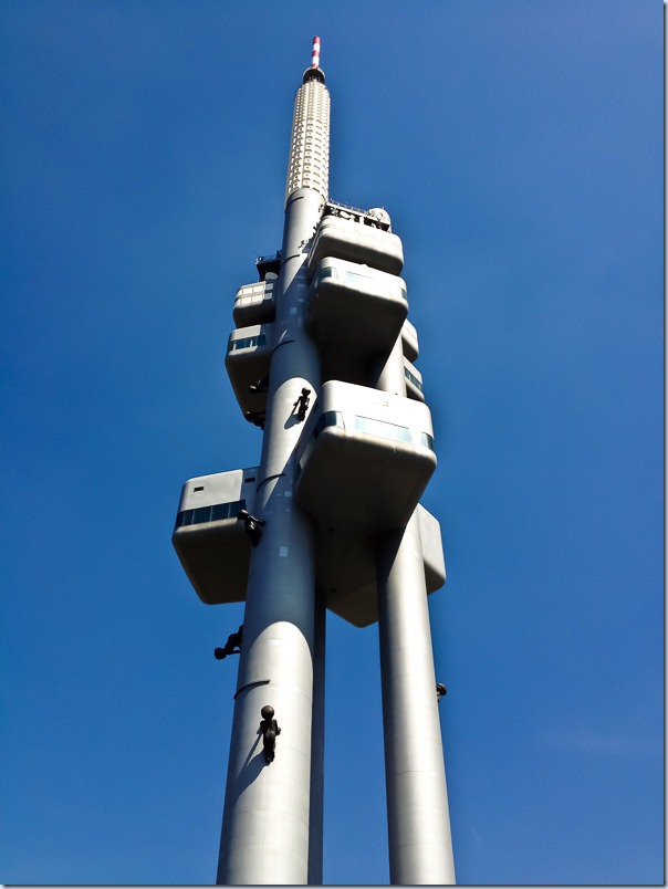 Если вернуться к фотографии с кедами, то по середине можно увидеть телебашню. В 2000 году Прагу признали культурной столицей Европы, и это здание было “украшено” черными младенцами. Спустя некоторое время правительство решило снять их, так как у города не было средств поддерживать скульптуры в воздухе. Но горожанам так понравились младенцы что они нашли какого-то частного инвестора, который купил суперклей и предотвратил катастрофу. Младенцы на башне висят по сей день (кстати парочка стоит на набережной, на них можно даже верхом посидеть). Телебашня была закрыта, так что на верх попасть не удалось.