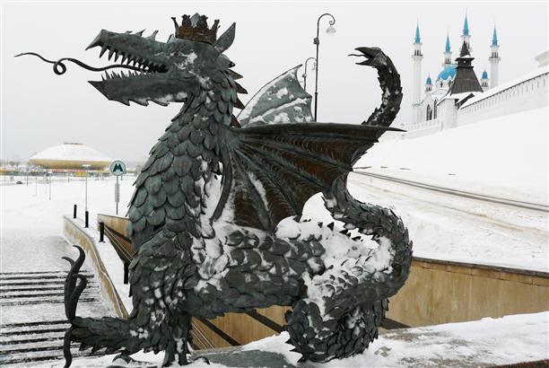 Мы нашли Зиланта у стен Казанского Кремля, прямо у входа в метро, а потом и в самом метро на потолке... Когда-то Зилант был отличительным знаком исключительно печати казанского хана, а после завоевания Казани Иван Грозный перенес его на государственную печать! Еще позже чудище стало украшением архитектуры многих русских усадеб, вписалось в парадные троны и пафосные фонтаны... В одной только Казани несколько фонтанов с Зилантом (правда, в связи с морозами, все они - под колпаком).