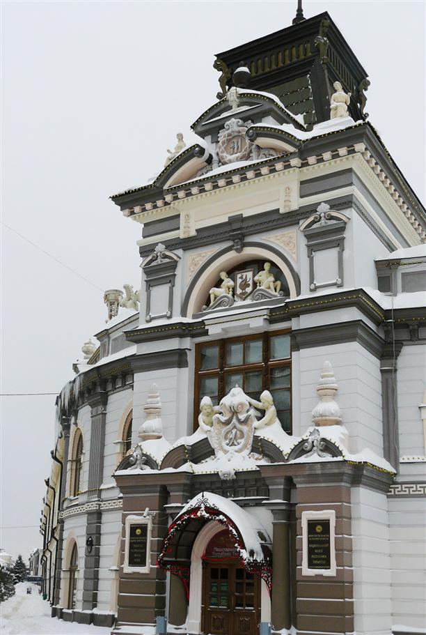 Красивое здание с белоснежными мраморными барсами у входа - это в общем-то железнодорожный вокзал. Его построили в 1893 году одновременно с прокладкой железной дороги в Татарстане. Знал бы этот милый и чистый вокзал в какую клоаку попадают пассажиры, садящиеся в поезд, следующий до Москвы... :))) А ведь прямиком на другой Казанский вокзал! Откровенный бомжатник с гадящими в зале нищими, бродячим собаками и бесчинствующими голубями. Где вас встречают матом и им же провожают (лирическое отступление).
