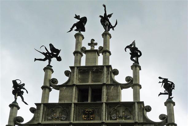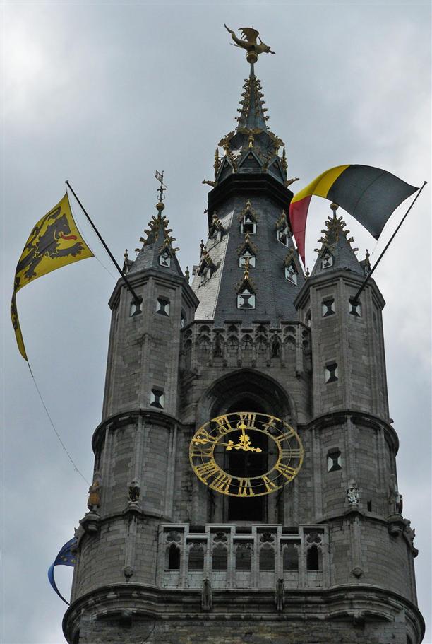 Башня Белфрай XIV века - абсолютная готика, увенчанная позолоченным драконом, символизирующим свободу, могущество и независимость Гента. У "золотого дракона" своя история: сначала он украшал нос корабля норвежского короля Сигрида Магнуссона во время крестового похода 1111 года, потом Собор Святой Софии в Константинополе, затем некоторое время прожил в бельгийской деревушке Бирвлит и еще немного в Брюгге, но вот уже 6 веков он сидит на Белфрае в Генте, смотря на город с высоты в 91 метр. А еще Белфрай украшают старейшие часы в Бельгии, рожденные в 1670 году.