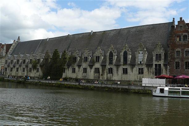 Если же от пушки пойти в обратном направлении и перейти через реку, то попадаешь в так называемые "графские владения". Раньше этот район принадлежал графу и не считался частью города. Два самых красивых здания найдутся сразу же после моста. Дом слева (по адресу Кранлей, 79) украшен иллюстрациями шести милосердных деяний. Было и седьмое - погребение усопших, но его на фасад не поместили: сюжет слишком мрачный. Сейчас в "доме милосердных деяний" - магазин сладостей, и там можно купить легендарные гентские кубердоны (тягучие сладкие трубочки).