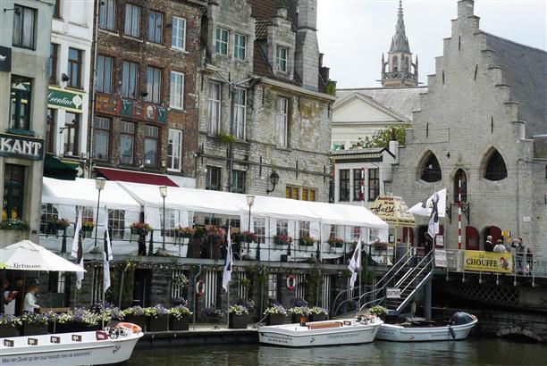 ...Белоснежные шатры, море цветуших петуний и музыка. Романтичный свадебный причал?.. Оказалось, "Beerhouse" :) Достаточно было зайти внутрь, вся "свадебная" символика сразу улетучилась! Каждый квадратный сантиметр был занят любителями пива, вся суета на улицах Гента показалось смешной относительно суеты, царящей внутри этого заведения. Сверхскоростные официанты, шумные компании, стучащие кружками по деревянным столам, постоянно открывающиеся и закрывающиеся двери! Меня начало закручивать по спирали :)) ...И если бы не сын, который строго сказал: "Мне кажется, здесь только поят, а не кормят":), я бы осталась там на денек-другой.