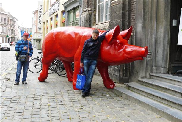 Затерявшись в старом городе, мы вдруг увидели красную свинью! Точнее, двух свиней... Одна отиралась у входа в небольшой магазин, вторая - бесстыдно заглядывала в церковь!