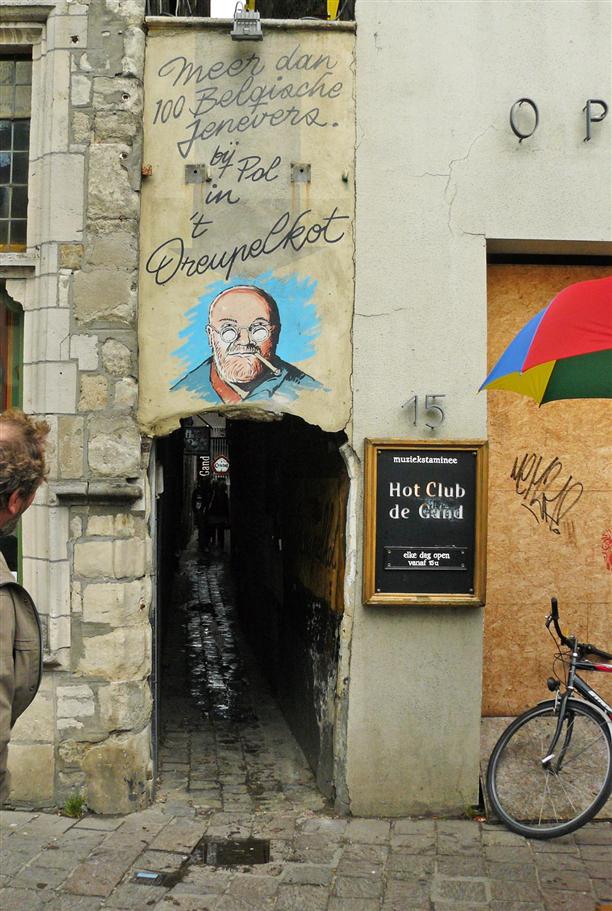 Hot Club de Gand - клуб, продвигающий акустическую живую музыку. Он находится на Groentenmarkt, 15, как раз в конце этого тесного проулка, и открывается только после 15.00. Но это мы узнали уже потом... А сначала я сходила "туда и обратно", изучила тамошнее меню и вернулась, не найдя строчки с супами :)) В Hot Club de Gand тоже поили, но не кормили.
