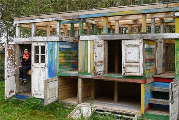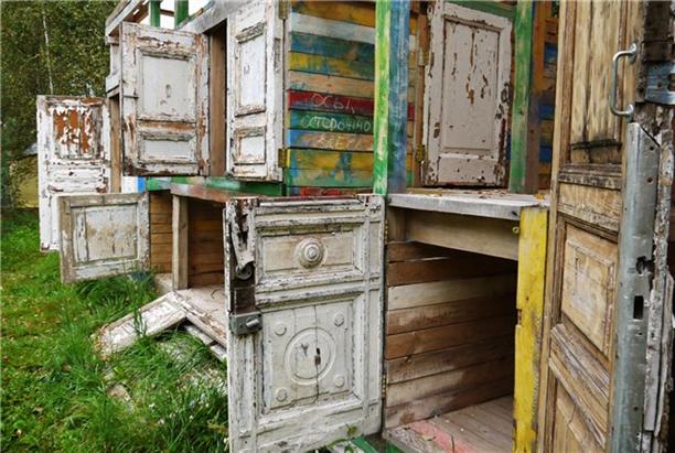 А это "Многокапсульный отель". в основе его небольшие спальные ячейки - они же капсулы, они же шкафы… Ноу-хау японцев! Подобные отели стали популярными благодаря расположению вблизи многолюдных мест (аэропортов, вокзалов, офисных центров, ночных клубов). Понятное дело, что в Никола-Ленивце представлен бомжатский чисто русский вариант - собранный из старой мебели, дверей и досок. всего в отеле 13 индивидуальных капсул и 6 семейных, есть номера с двумя и тремя выходами для людей, боящихся замкнутых пространств. Меня, конечно, покорила коллекция старых дверей! :)