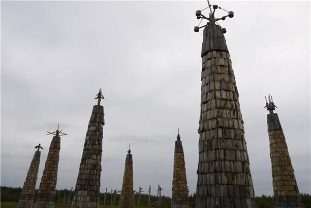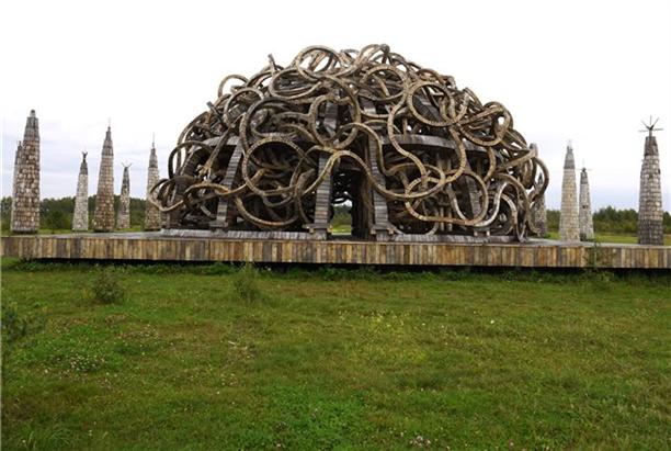 "Вселенский разум". Николай Полисский - художник и вдохновитель всего проекта в целом - решил создать в Никола-Ленивце собственный искусственный интеллект. Он создавал его три года! В центре инсталляции червивый дом скульптура двух полушарий механического мозга, к ним ведёт жертвенный лес колоннада из сорока двух космических ракет. Все настолько масштабно, что попадая на территорию "мозга", ощущаешь себя пленником племени Майя маленьким винтиком огромной сокрушающей машины :)