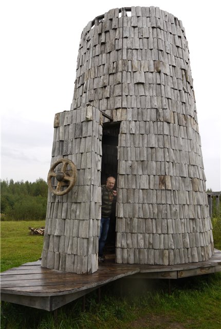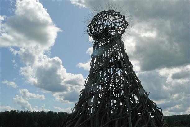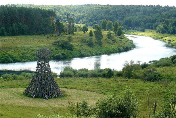 К примеру, «Маяк» (2004 года рождения)! Место для него выбрано просто нереальной красоты. Вокруг трава скошена в форме круга (как в правильном фильме про инопланетян), стоит Маяк на изгибе реки Угры, у подножия того самого холма, по которому спускалась армия снеговиков. Представляет из себя хитросплетение веток и напоминает гигантское вертикальное гнездо. Когда подходишь к нему, сложно предположить, что на его вершину можно забраться по «винтовой лестнице». А когда забираешься, понимаешь - вот она вершина мира! ;) хотя, в высоту сооружение метров 15, не больше.