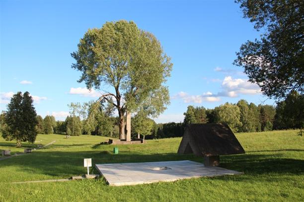 Черная плита-крыша отмечает место, где находился амбар, в котором сожгли жителей Хатыни.