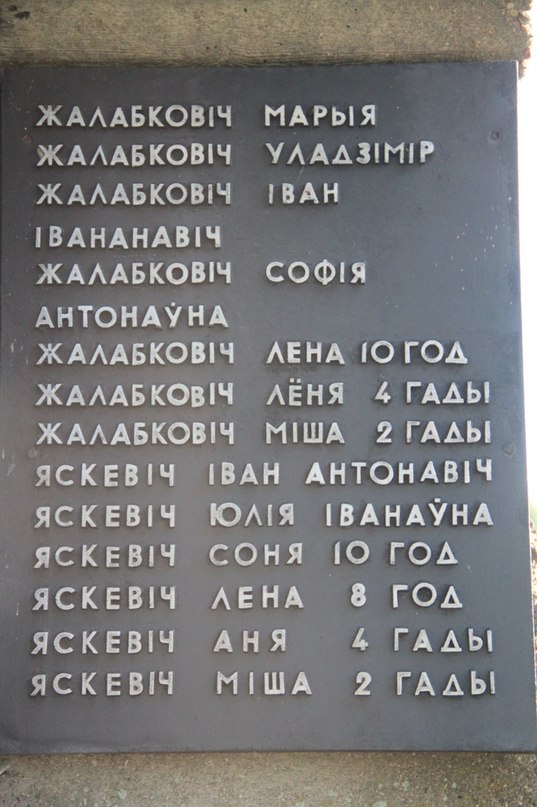 Это произошло 22 марта 1943 года. Озверевшие фашисты ворвались в деревню Хатынь и окружили ее. Жители деревни ничего не знали о том, что утром в 6 км от Хатыни партизанами была обстреляна автоколонна фашистов и в результате нападения убит немецкий офицер. Но ни в чем не повинным людям фашисты уже вынесли смертный приговор. Все население Хатыни от мала до велика — стариков, женщин, детей выгоняли из домов и гнали в колхозный сарай. Прикладами автоматов поднимали с постели больных, стариков, не щадили женщин с маленькими и грудными детьми. Сюда привели семьи Иосифа и Анны Барановских с 9 детьми, Александра и Александры Новицких с 7 детьми; столько же детей было в семье Казимира и Елены Иотко, самому маленькому исполнился только один год. В сарай пригнали Веру Яскевич с семинедельным сыном Толиком. Леночка Яскевич вначале спряталась во дворе, а затем решила надежно укрыться в лесу. Пули фашистов не смогли догнать бегущую девочку. Тогда один из фашистов бросился за ней, догнав, расстрелял ее на глазах у обезумевшего от горя отца. Вместе с жителями Хатыни в сарай пригнали жителя деревни Юрковичи Антона Кункевича и жительницу деревни Камено Кристину Слонскую, которые оказались в это время в деревне Хатынь.