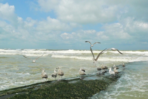 На побережье ветер страшной силы! Чайки зависают в воздухе, никуда не двигаясь... Люди держатся за фонарные столбы при особо сильных порывах...