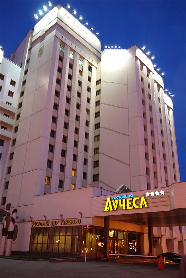 Первым делом решаем найти гостиницу. Мега-гиганты советских  времён «Витебск» и «Двина» свободными номерами не располагают.  Нас выручает отель «Лучеса» (проспект Строителей, 1).  Двухкомнатный «бизнес-номер» стоит 2700 р. («стандарты» все разобраны). Вывод  – бронируйте заранее, обойдётся дешевле. Портрет «Лучесы» есть, но ночной :)