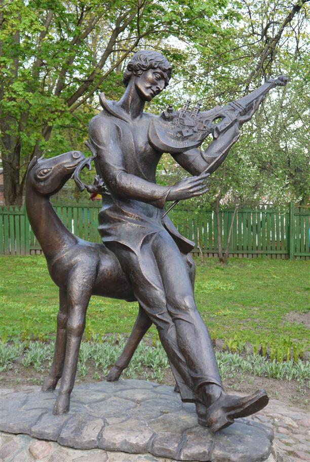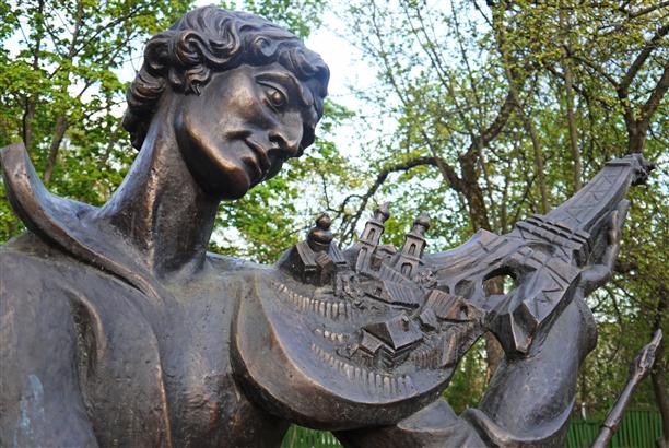 На заднем дворике стоит памятник Шагалу - "Витебская мелодия на французской скрипке". Любимые васильки, Эйфелева башня и ностальгия по белорусской родине... Калитка к скрипачу открыта даже после закрытия музея.