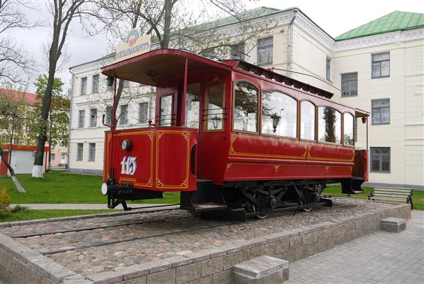 У трамвайного депо (пр. Фрунзе, 29) стоит вот такой весёленький трамвайчик. Кстати, трамвай в Витебске появился в 1898 году, на год раньше, чем в Москве и на 9 лет раньше, чем в Питере. Ездил он со скоростью 14 вёрст в час и выглядел именно так.