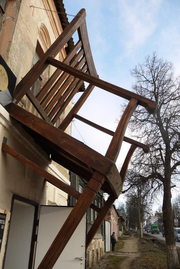 На Тульской, 5 - гигантский стул. Он отлично вписался в стену антикварного магазина :) и сразу стал местной достопримечательностью.