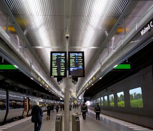 И, наконец, вокзал в Мальмё! Нигде такого не видела, поэтому расскажу. На стены туннеля проецируется изображение: окна, за которыми "бегут" леса-поля-реки-города. То есть стоишь, ждёшь поезда, а ощущение такое, что ты уже куда-то едешь в огромном вагоне! Выглядит это так (источник фото http://static.panoramio.com, своё сделать не успела). Всё естественно сопровождается музыкой :)