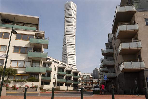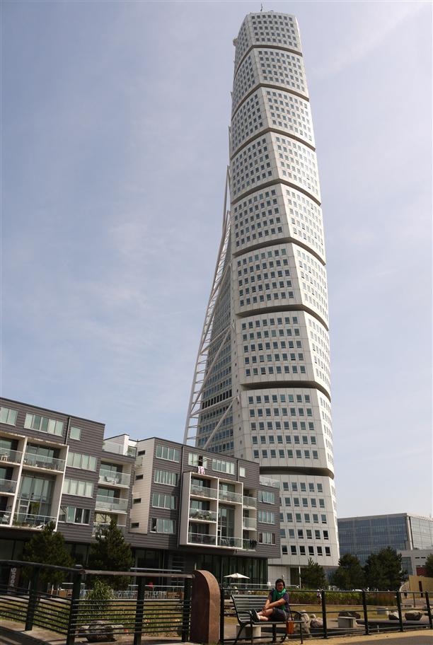 Еще одна фишка Мальмё - его знаменитый небоскреб «Повернутый торс». 190 метров высотой, 54 этажа с жилыми апартаментами и почти 90-градусный поворот вокруг своей оси. Все остальные домики в этом районе малоэтажные, поэтому с высоты птичьего полёта это выглядит очень круто!