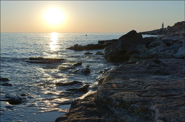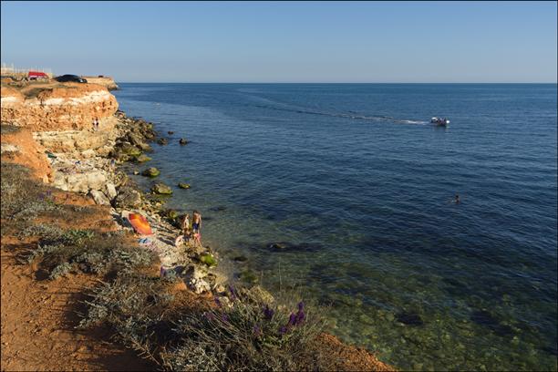 Довольно знаменитое, кстати, место. Именно на его берегу находятся легендарная 35-я береговая батарея и красивейшая Голубая бухта, уже упомянутый Страбонов Херсонес, а если добраться до самой оконечности мыса, можно увидеть высокий белоснежный маяк — правда, только издали, он в ведомстве Черноморского флота России, и, само собой, окутан колючкой и охраняется. Ну и к тому же побережье мыса — судя по количеству автомобилей вокруг — весьма популярное место отдыха горожан.