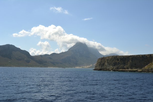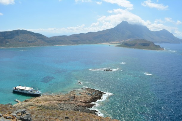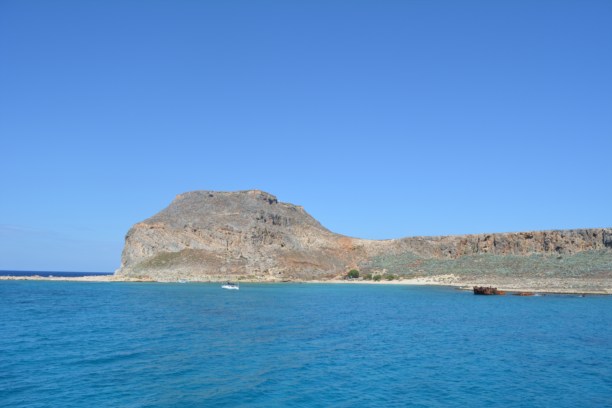 Но всегда есть выход: из городка-порта Киссамос ходят трижды в день корабли, которые доставляют туристов сначала на остров, а потом и в бухту. Честно говоря, те 1,5 часа, что мы ехали, я во все глаза смотрела на полуостров, который мы огибали. Это нереально красиво! Высокий берег-гора из известняка и солончака стоит хладнокровно и монументально. Люди? Какие люди? Он там миллионы лет и еще столько же простоит!  Именно на высоких берегах можно увидеть удивительный природный отпечаток: тысячелетия назад случилось землетрясение, сдвинулись плиты и остров поднялся на 9 метров! Место старого «нахождения» моря видно до сих пор-черная черта хорошо различима над поверхностью воды.