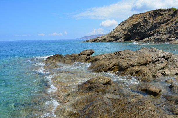 Погуляв по роще, искупавшись в реке и чуть не утопив обручальное кольцо в море, отправились дальше. Проезжали через городок Плакиас с неспокойным морем в галечной бухте, проезжали еще несколько крошечных заливов, пока дорога не стала круто забирать в горы. Вот тут уже начался настоящий серпантин с отметками высот на асфальте и с приличной крутизной. Такой, что наш малыш еле взбирался на своем литровом движке. И чем выше поднимались - тем невероятнее вид открывался на побережье.